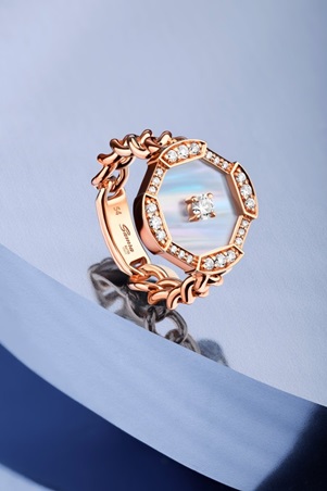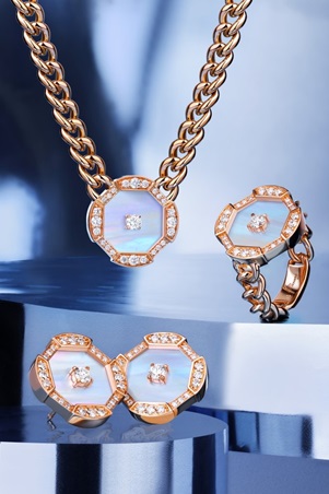 يأتي الرمز منفذاً من عرق اللؤلؤ المضيء، ومحاطاً بالألماس، ومعلّقاً على سلسلة من الذهب الوردي، في توليفة تعكس هوية الدار. هذا التباين بين نعومة المواد ودقة الهندسة يخلق قطعة تبدو رقيقة وقوية في آن، تماماً كالفكرة التي تنطلق منها المجموعة.