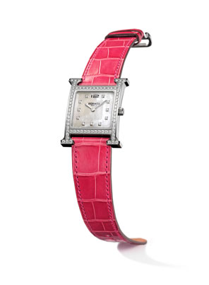 رُصّع غطاء الساعة الفولاذي الذي تبلغ أبعاده 26 ميلليمتراً بـ72 ماسة تبرز الشكل الأصلي للساعة: حرف H الشهير الذي يرمز إلى Hermès. وقد زوّد هذا الموديل بسوار يد ناعم بلون توت العليق مصنوع من جلد التمساح ليضيف للساعة لمسة دافئة وطبيعية وليحدث تبايناً لافتاً للأنظار مع البريق الأبيض الصافي الصادر عن غطائها. وبفضل أداة خاصة مرفقة بالساعة، يمكن لمالك الساعة تغيير سوارها بسرعة ويسر.