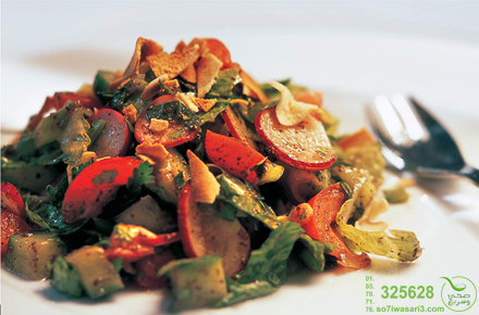 يقدم الفتوش مزيّناً بباقي الخبز المحمص.