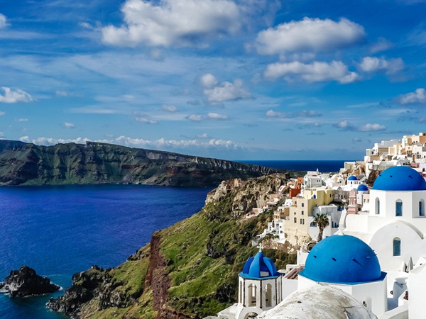 سانتوريني: جزيرة تعتبر واحدة من أجمل الجزر في اليونان، مع مناظرها الخلابة والمباني البيضاء ذات الأسقف الزرقاء المميزة.