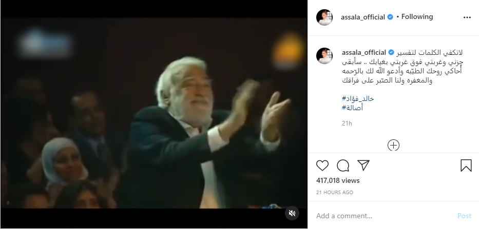 وكتبت أصالة عبر حسابها الشخصي على انستقرام: "لاتكفي الكلمات لتفسير حزني وغربتي فوق غربتي بغيابك.. سأبقى أُحاكي روحك الطيّبة وأدعو الله لك بالرّحمة والمغفرة ولنا الصّبر على فراقك".