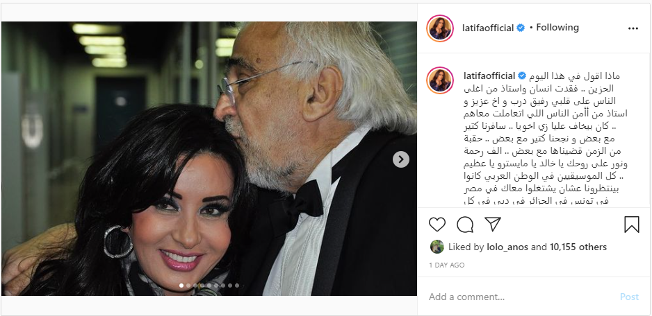 ونشرت لطيفة صورا لها مع الراحل خالد فؤاد، عبر حسابها الرسمي بموقع "إنستقرام"، وعلّقت: "ماذا أقول في هذا اليوم الحزين؟ فقدت إنسان وأستاذ من أغلى الناس على قلبي، رفيق درب وأخ عزيز وأستاذ من أأمن الناس اللي اتعاملت معاهم".