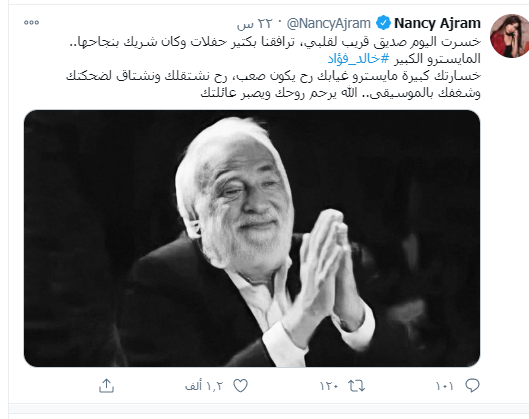 وبأسى وحزن شديد نعت الفنانة نانسي عجرم، الموسيقار، وكتبت عبر حسابها على "تويتر": "‏خسرت اليوم صديق قريب لقلبي، ترافقنا بكتير حفلات، وكان شريك بنجاحها.. المايسترو الكبير ‎خالد فؤاد.. خسارتك كبيرة.. مايسترو غيابك رح يكون صعب، رح نشتقلك ونشتاق لضحكتك وشغفك بالموسيقى.. الله يرحم روحك ويصبر عائلتك".