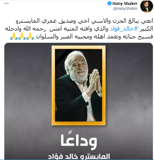 ونشر الفنان هاني شاكر صورة الراحل، عبر حسابه الرسمي بموقع "تويتر"، وعلّق: "أنعي ببالغ الحزن والأسى أخي وصديق عمري المايسترو الكبير خالد فؤاد والذي وافته المنية، رحمه الله وأدخله فسيح جناته وتغمد أهله ومحبيه الصبر والسلوان".