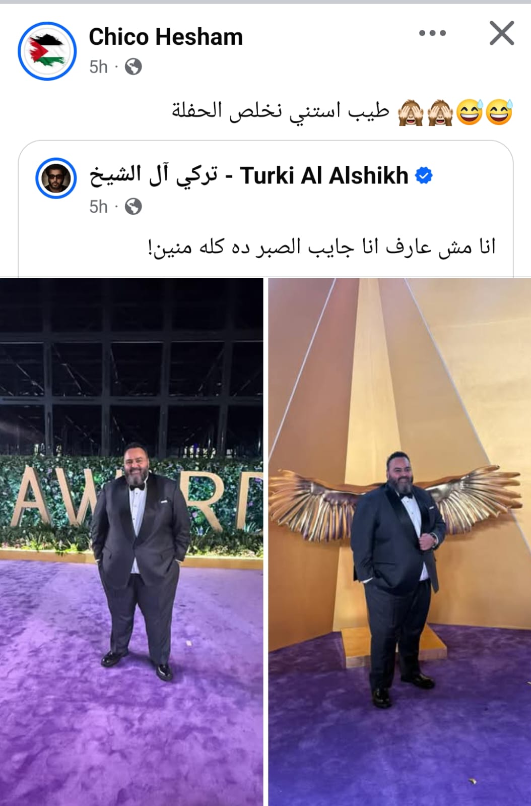 ونشر آل الشيخ صورتين للفنان شيكو من الحفل، معلقاً: "أنا مش عارف أنا جايب الصبر ده كله منين"، ليرد شيكو على الفور في منشور آخر: "طب استنى لما الحفلة تخلص".