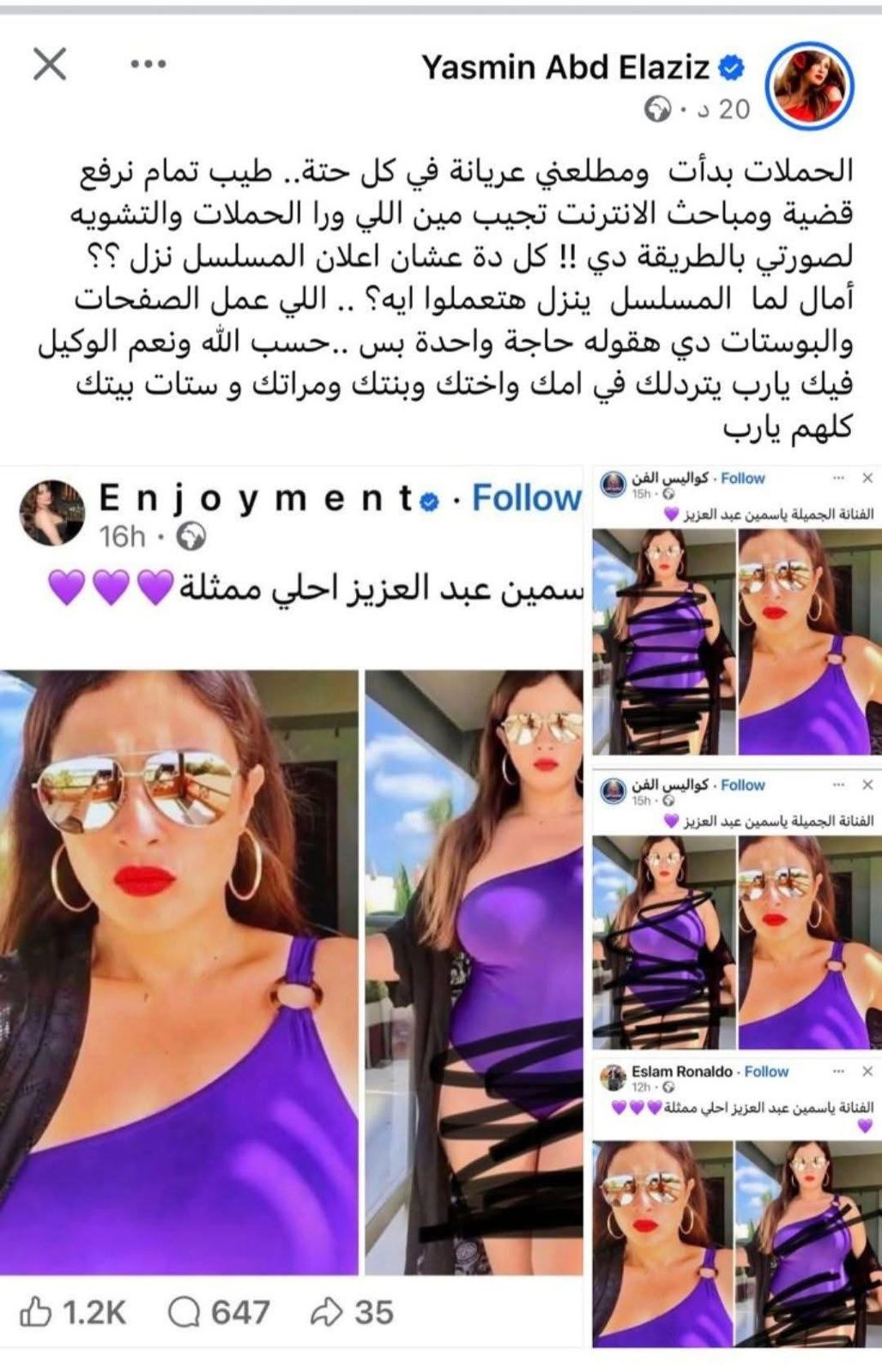 ونشرت ياسمين عبد العزيز عبر حسابها الرسمي على موقع "فيسبوك" لقطات شاشة لعدد من هذه الصور، والتي أظهرت استغلال ملامحها وتركيبها على صور غير لائقة باستخدام برامج الذكاء الاصطناعي.